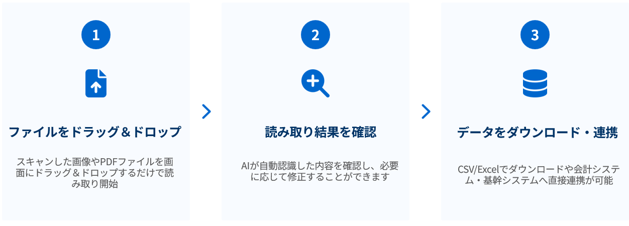 AI-OCRは機械学習を活用し、書体の違い、手書き文字、レイアウトの揺らぎ(位置ズレ・罫線・表組み等)にも対応しやすいのが特長です。読み取り精度の向上により、手入力や転記の工数を減らし、入力ミスなどのヒューマンエラー抑制や、繁忙期の大量処理の負担軽減にもつながります。